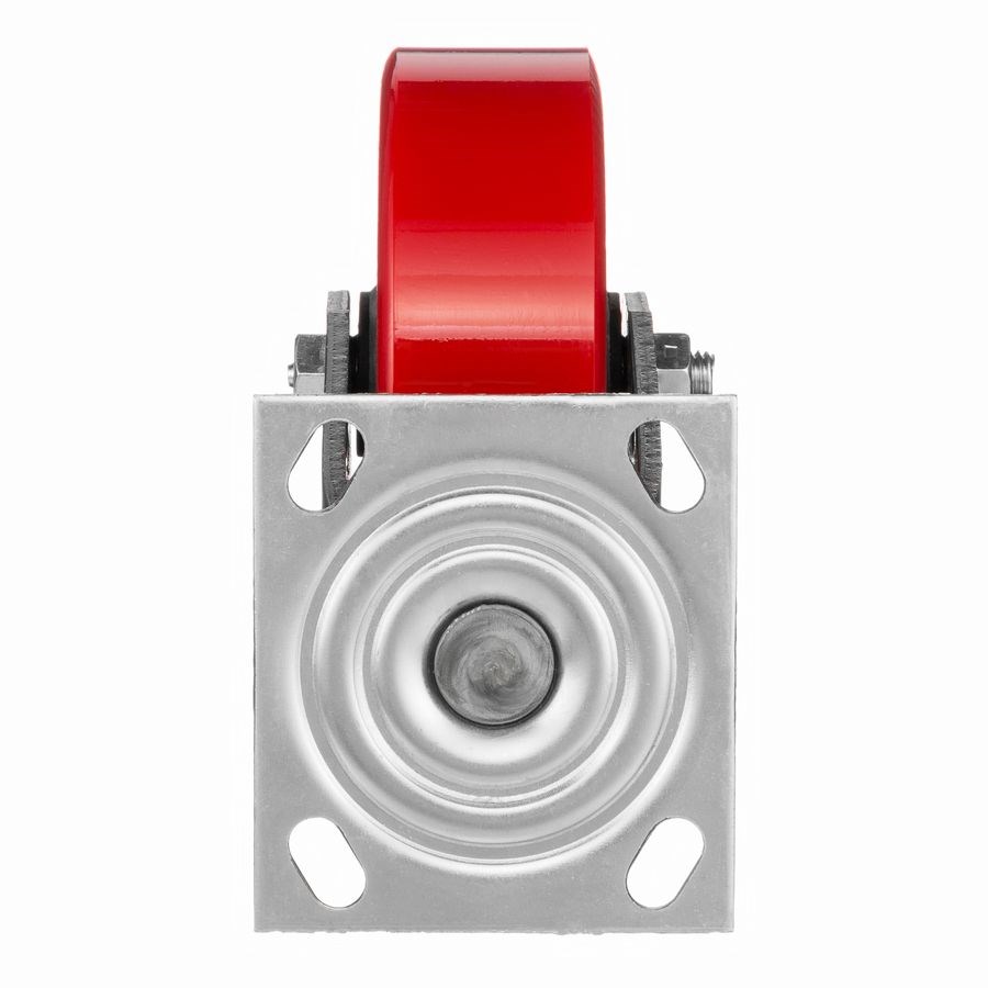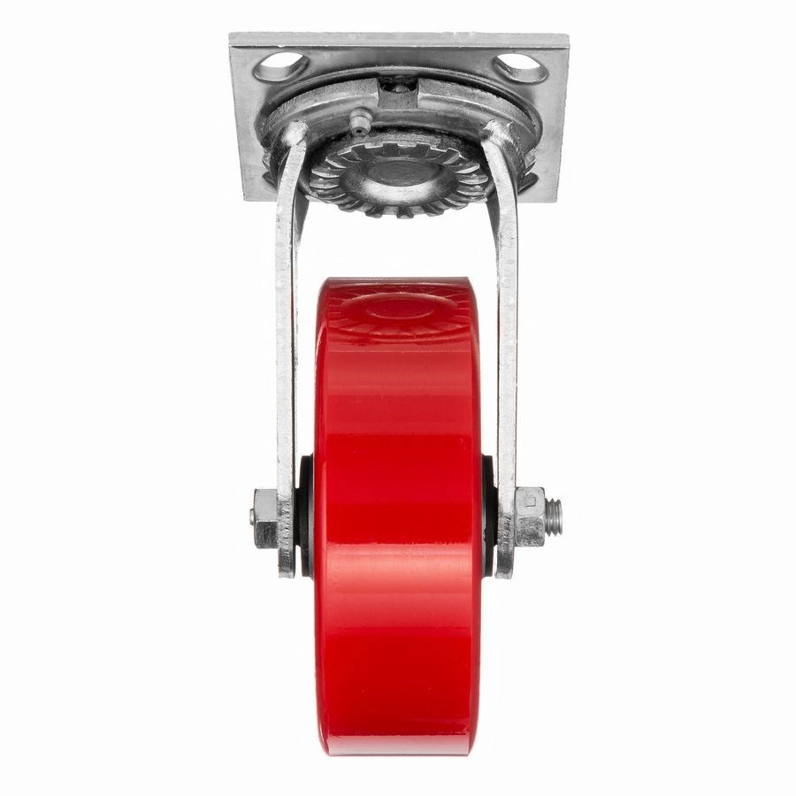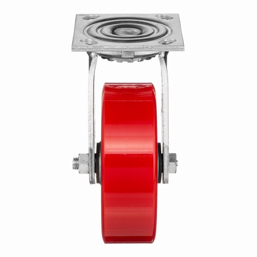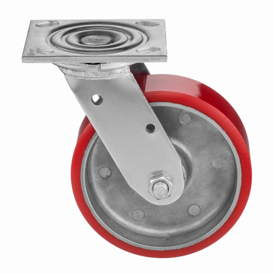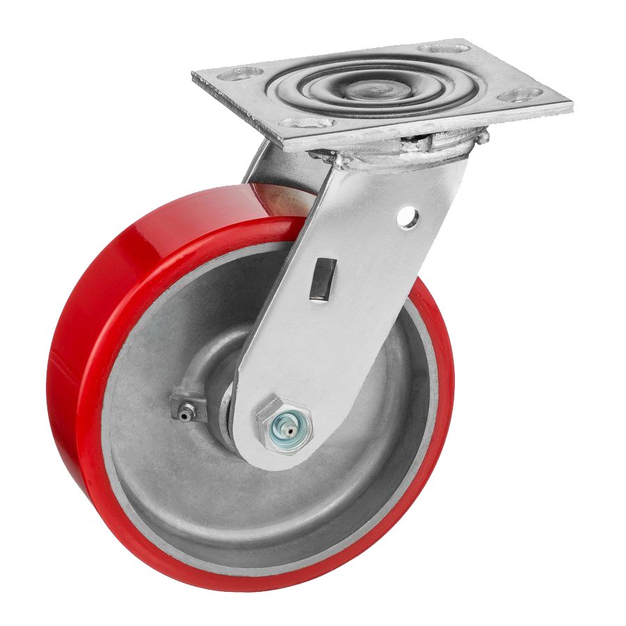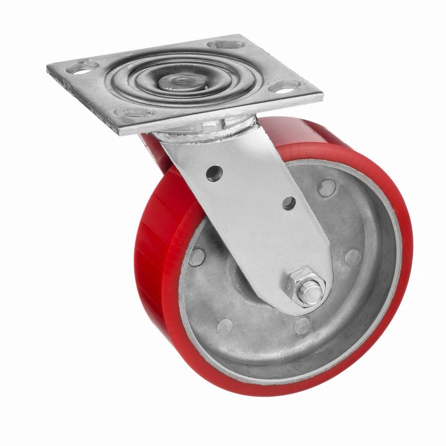 Колесо полиуретановое, центр из литого чугуна. В оси колеса-игольчатый подшипник. Поворотный кронштейн имеет двурядный подшипник. Наличие масленки позволяет периодически обслуживать колесо. Крепление площадка под 4 болта. Колеса полиуретановые с чугунным сердечником широко применяются на бетонных полах преимущественно внутри помещений.