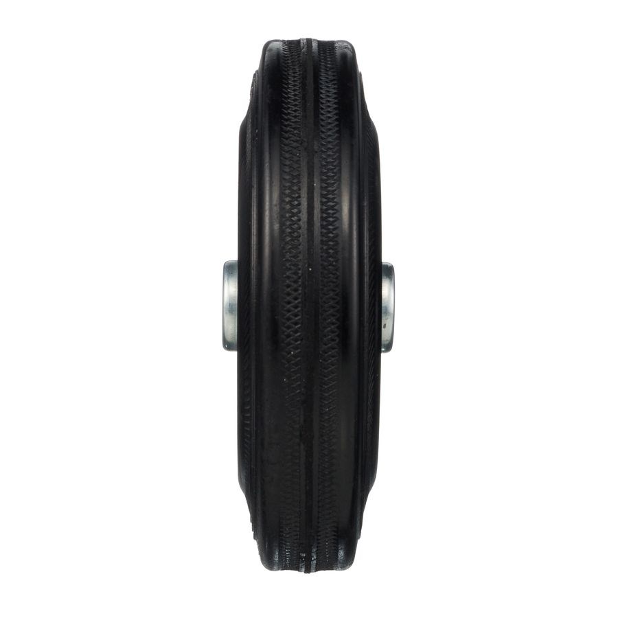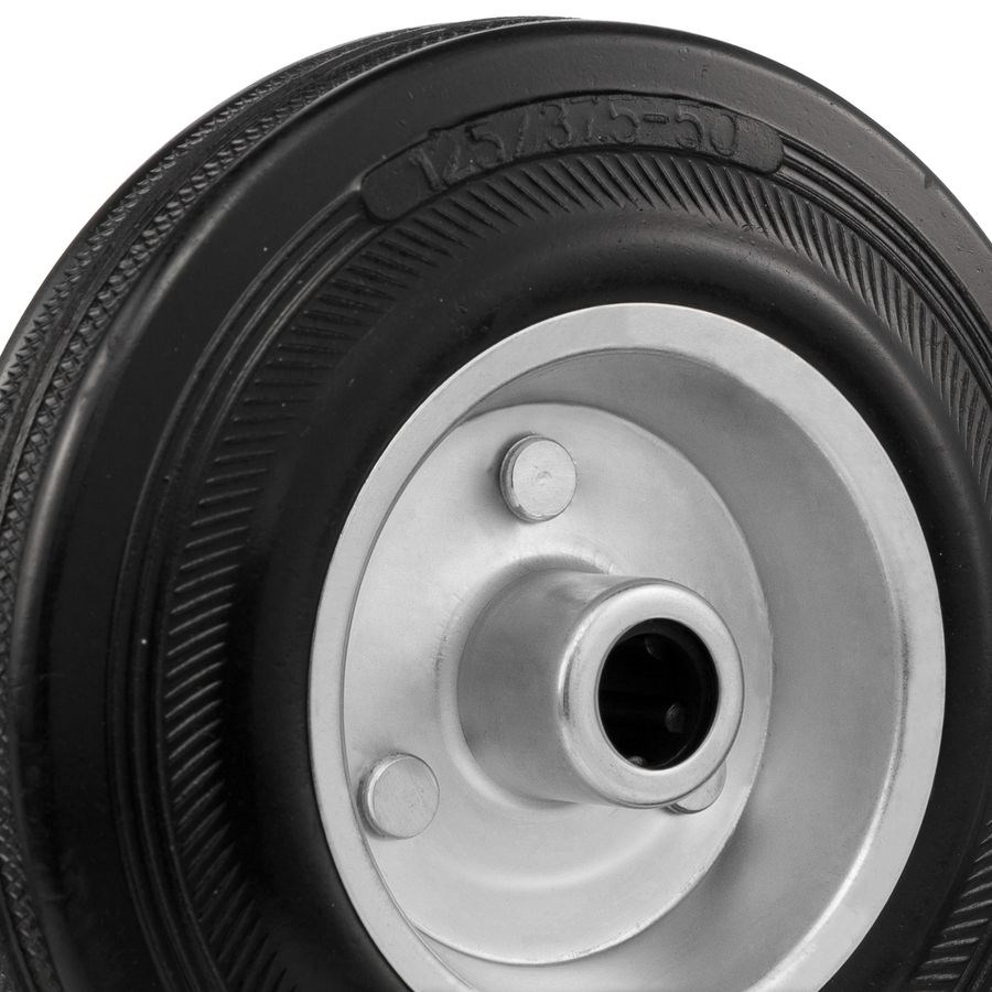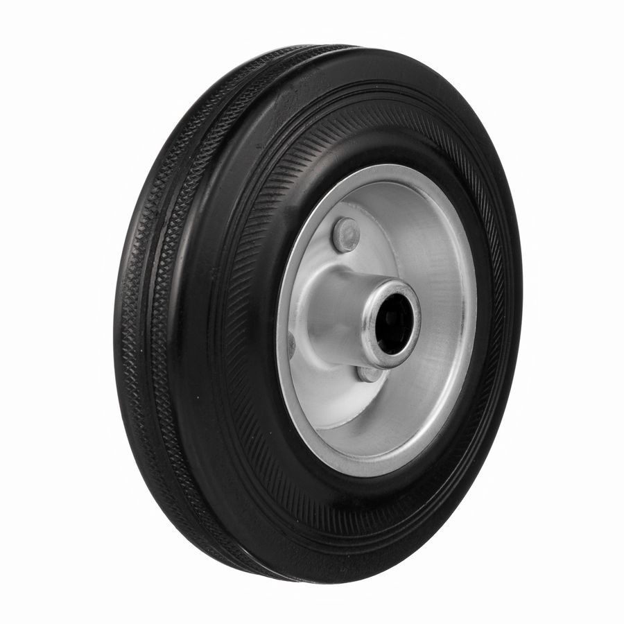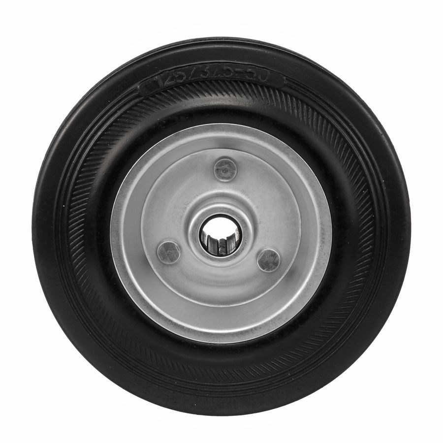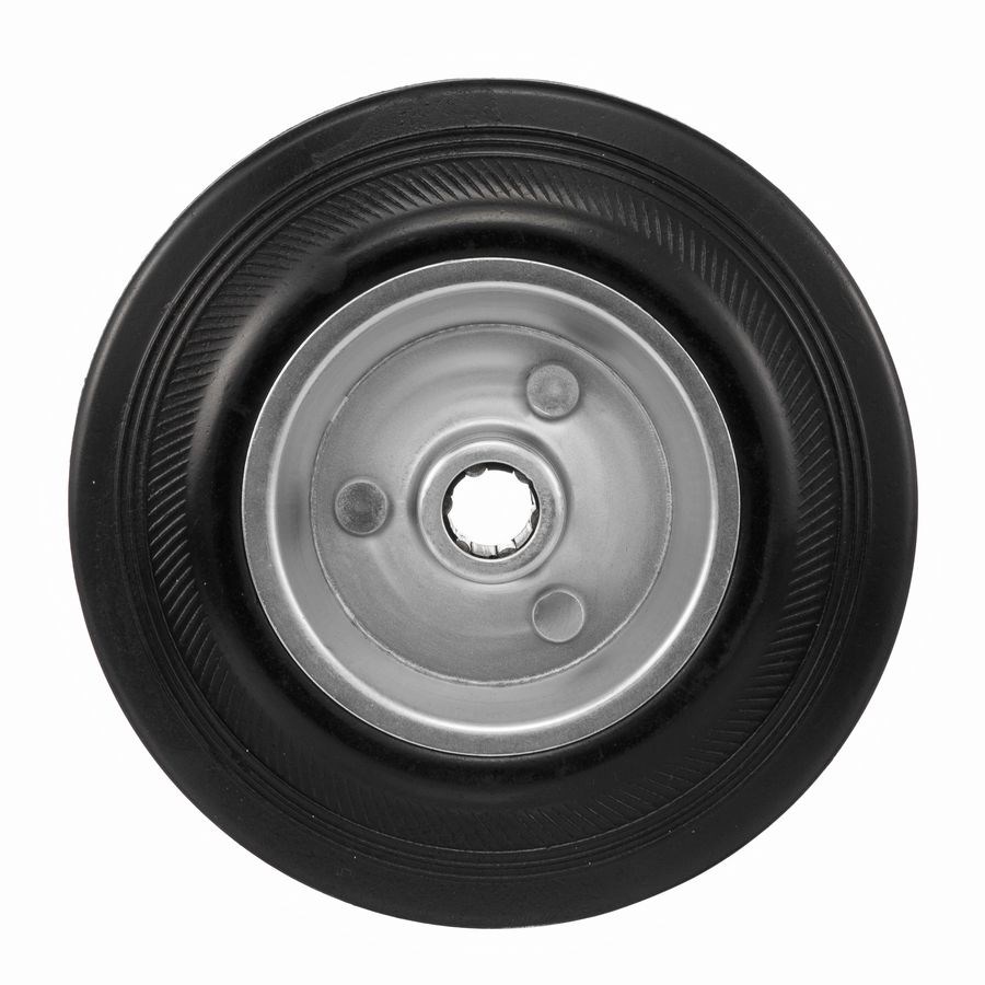 Центр из стального оцинкованного обода из штампованной стали. В оси колес роликовый подшипник. Колеса из черной резины, центр из двух гальванизированных дисков из штампованной стали. Роликовый (игольчатый) подшипник расположен в углублении, выдавленном под прессом, и содержит цилиндрические ролики подшипника. Возможно применение на относительно грубых полах складов, заводов, производственных и строительных площадках.