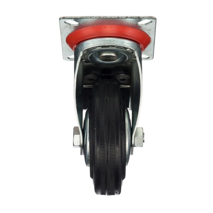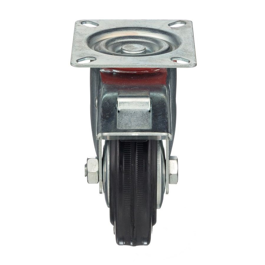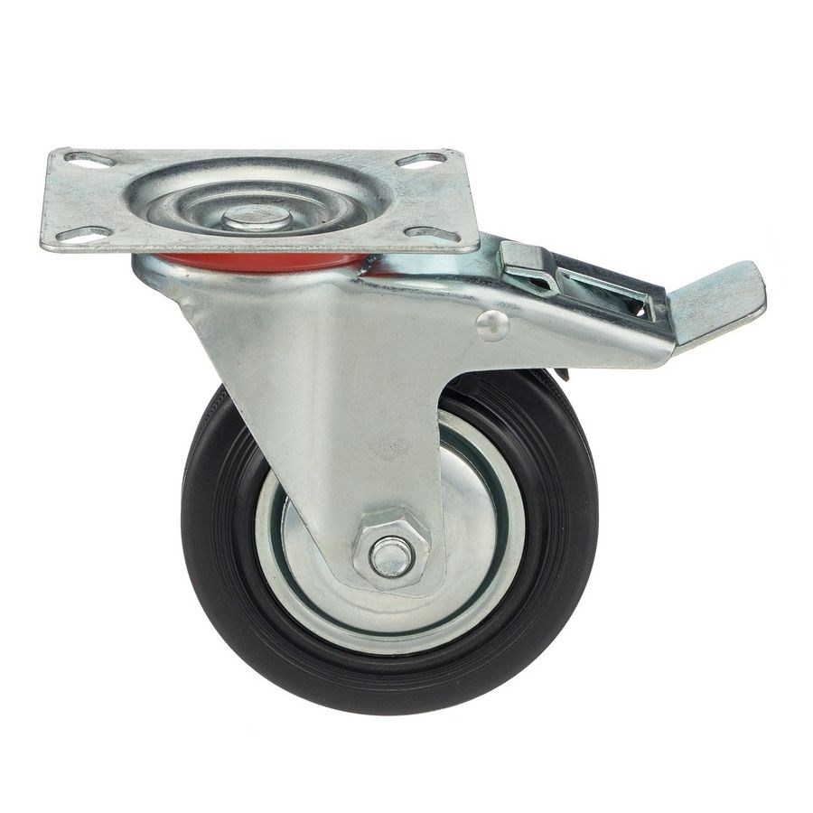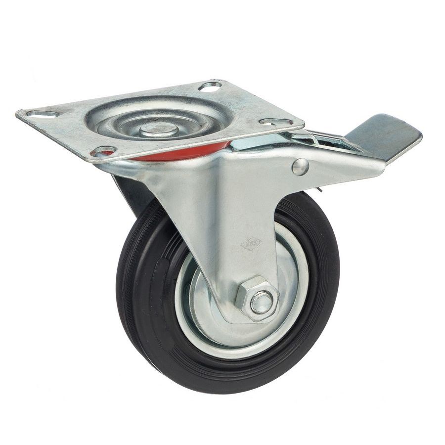 Колесо поворотное с тормозом 4003-100. Колеса из черной литой резины, центр из двух гальванизированных дисков из штампованной стали.