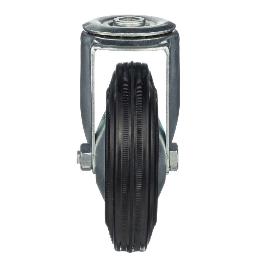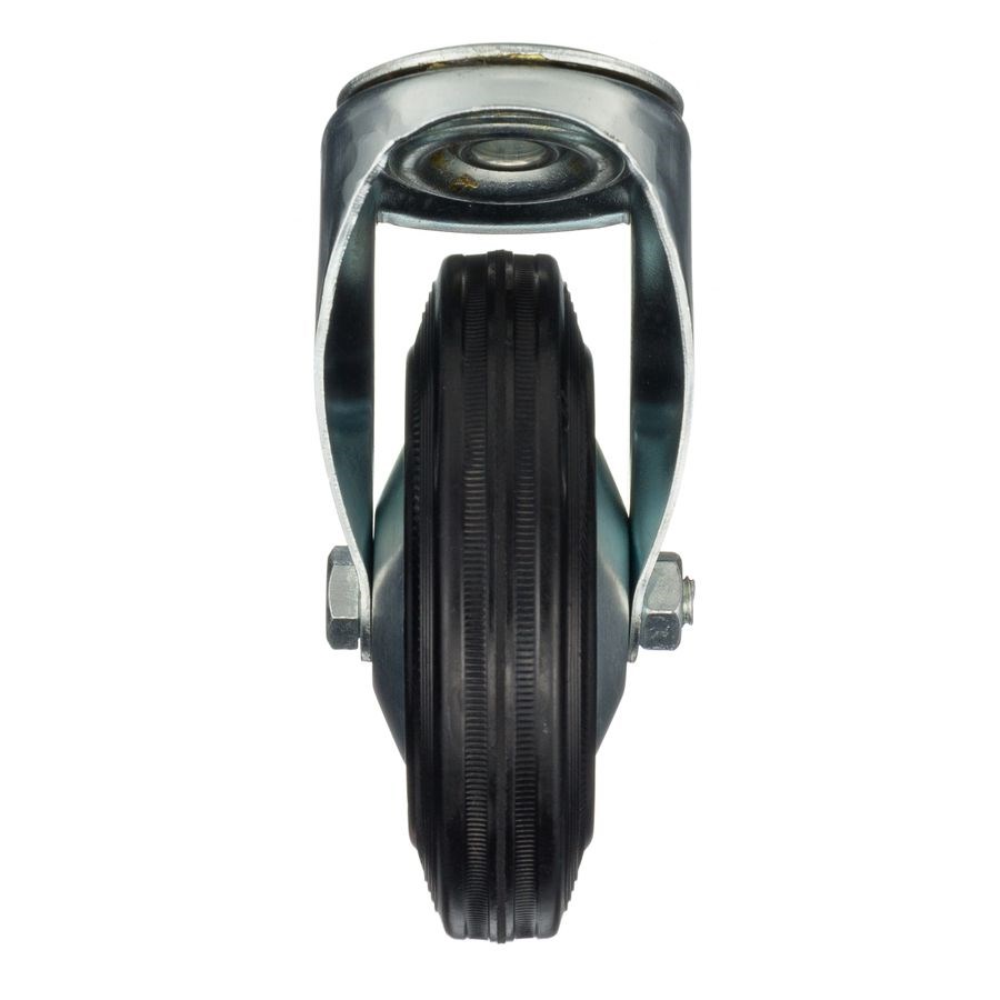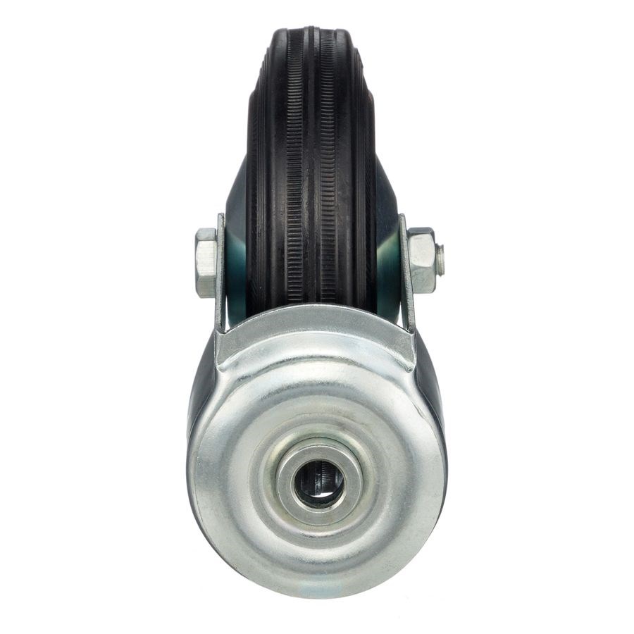 Колеса из черной литой резины, центр из двух гальванизированных дисков из штампованной стали. Роликовый (игольчатый) подшипник расположен в углублении, выдавленном под прессом, и содержит цилиндрические ролики подшипника. Кронштейн изготовлен прессованием из листовой стали. В поворотном узле двухрядный шарикоподшипник.
