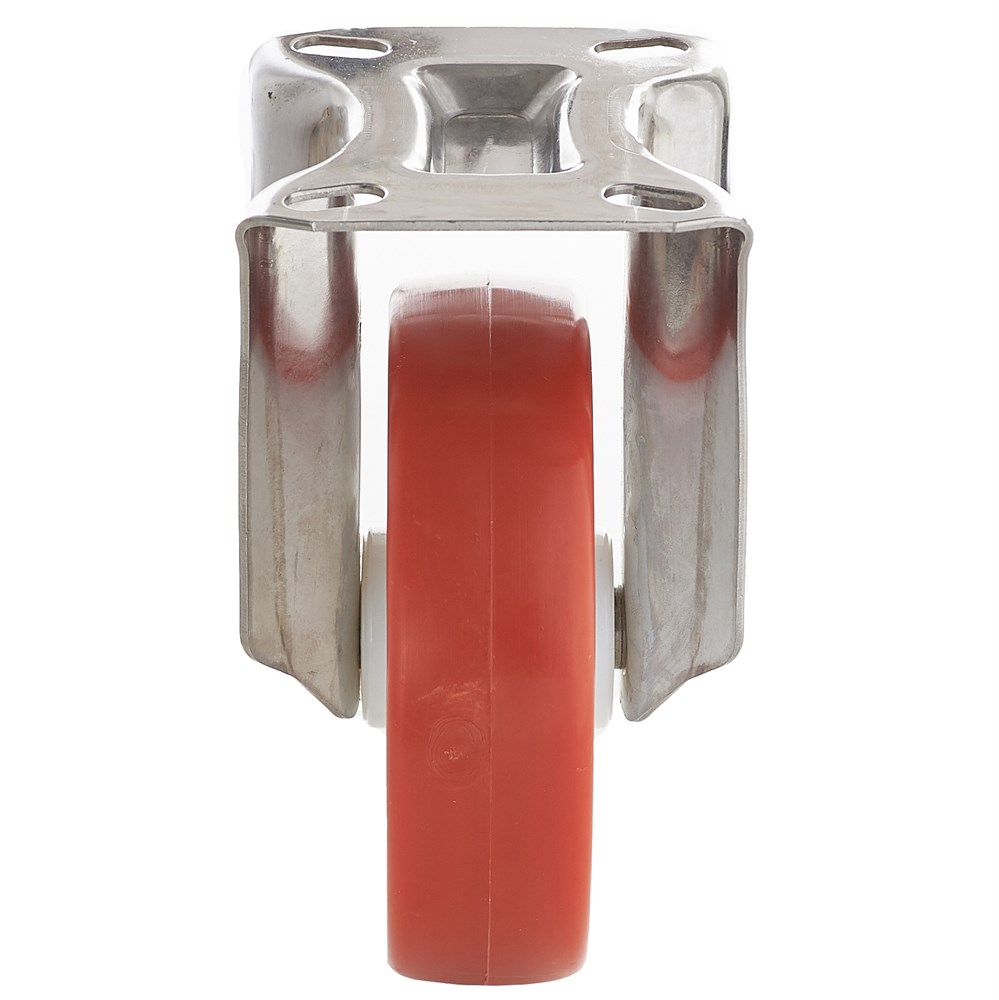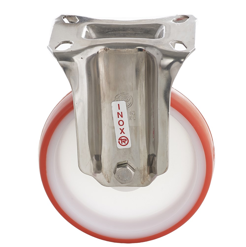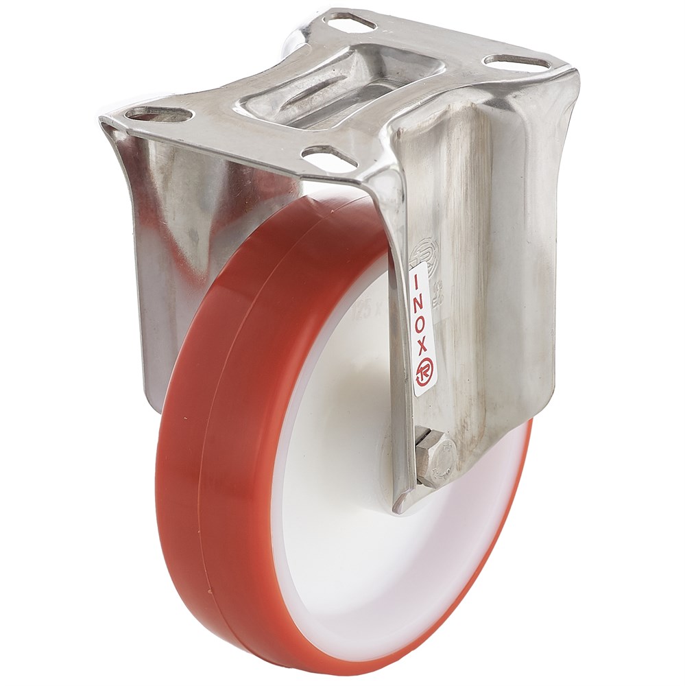 Колесо неповоротное на фиксированном кронштейне из нержавеющей стали. Контактный слой из термопластичного полиуретана твердостью 55 Шор D. Основание: полиамид 6. Ступица оснащена подшипником скольжения (втулка). Фиксированный кронштейн серии NLX из нержавеющей стали прослужит в 3 раза дольше оцинкованного аналога. Полиуретановый слой значительно снижает шум и вибрацию, бережно относиться к полам.