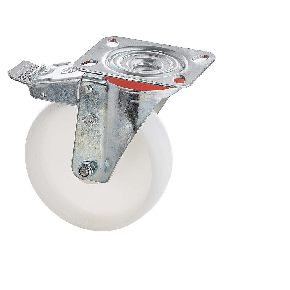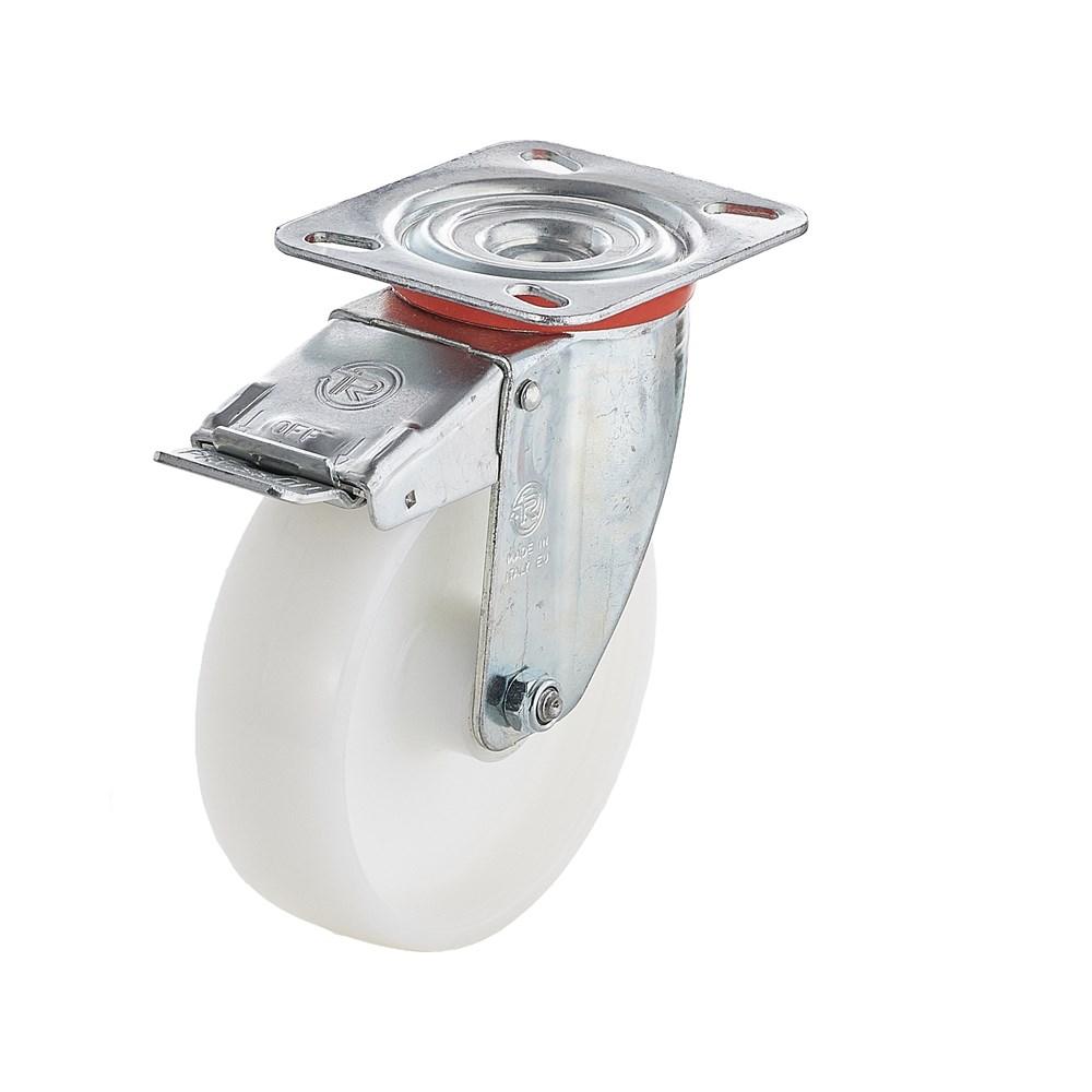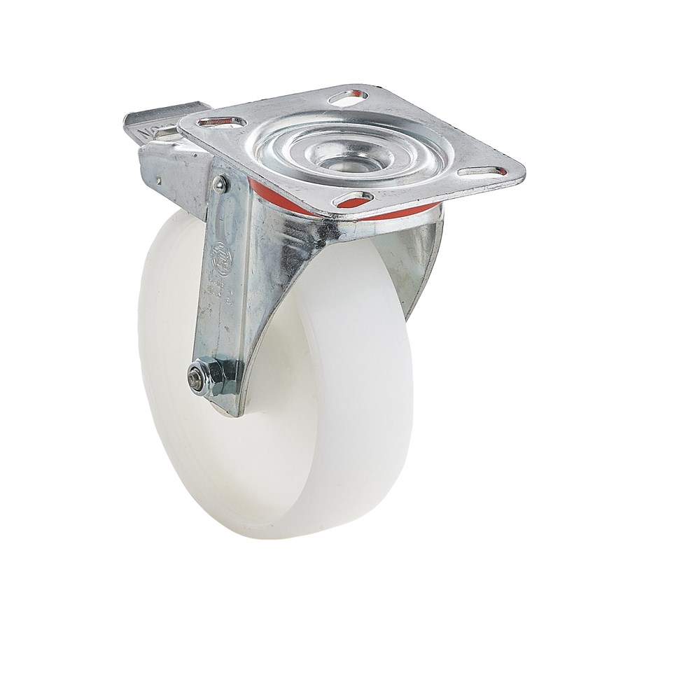 Основание: монолитное полиамид 6. Ступица оснащена подшипником скольжения. Качественный поворотный оцинкованный кронштейн с тормозом серии NL оснащен двухрядным подшипником. Тормоз блокирует вращение колеса, а так же вращение самого кронштейна относительно площадки крепления.
