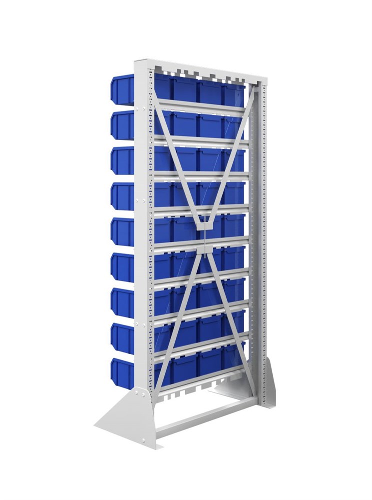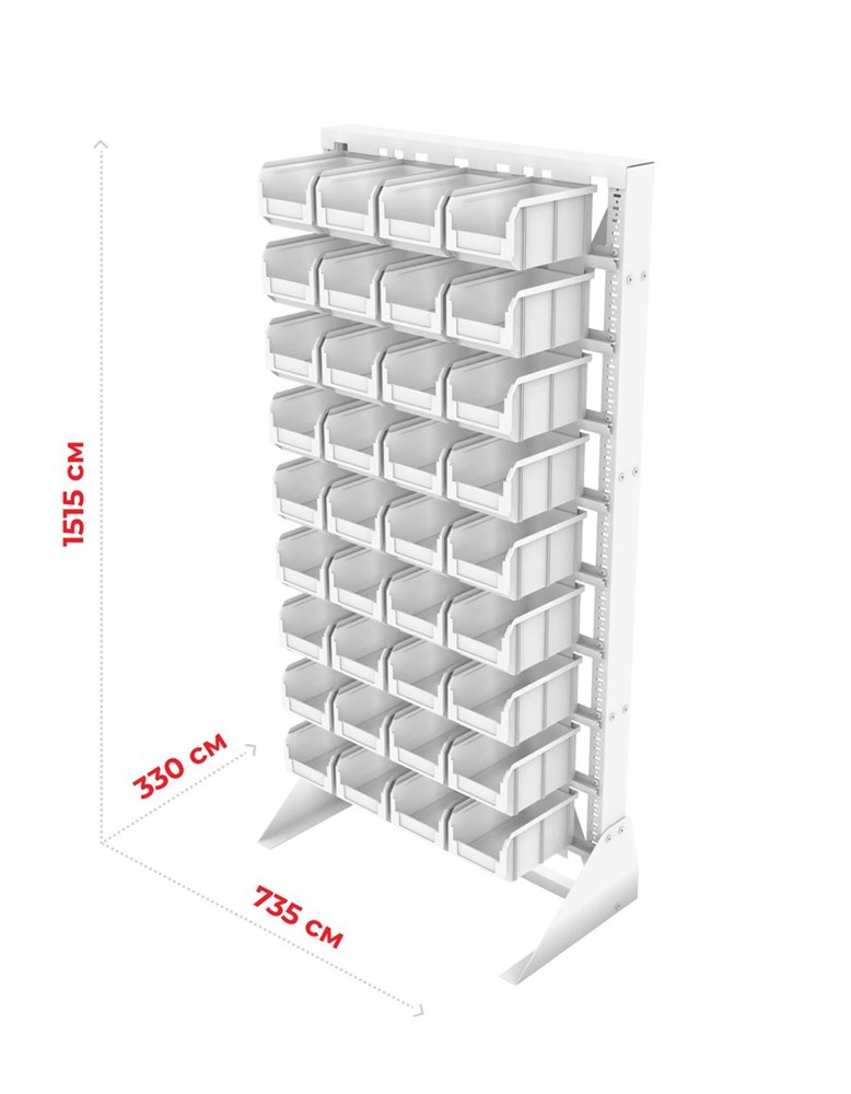 Преимущества: Хороший визуальный обзор содержимого. Каждый ящик оснащен специальным кармашком, позволяющим вставить этикетку для индикации содержимого. Конструкция стойки позволяет легко извлекать нужный ящик и так же легко устанавливать его на место. Быстрая сборка. Высокая прочность. Габариты: 735х330х1500мм., вес 27,5кг.