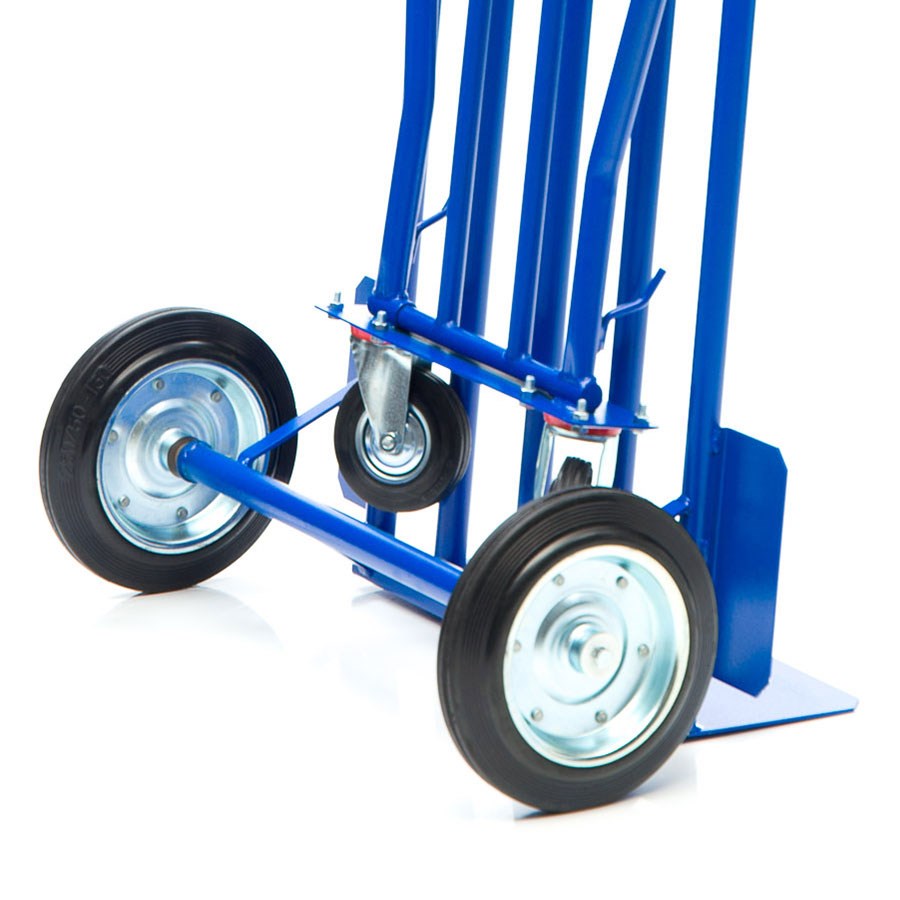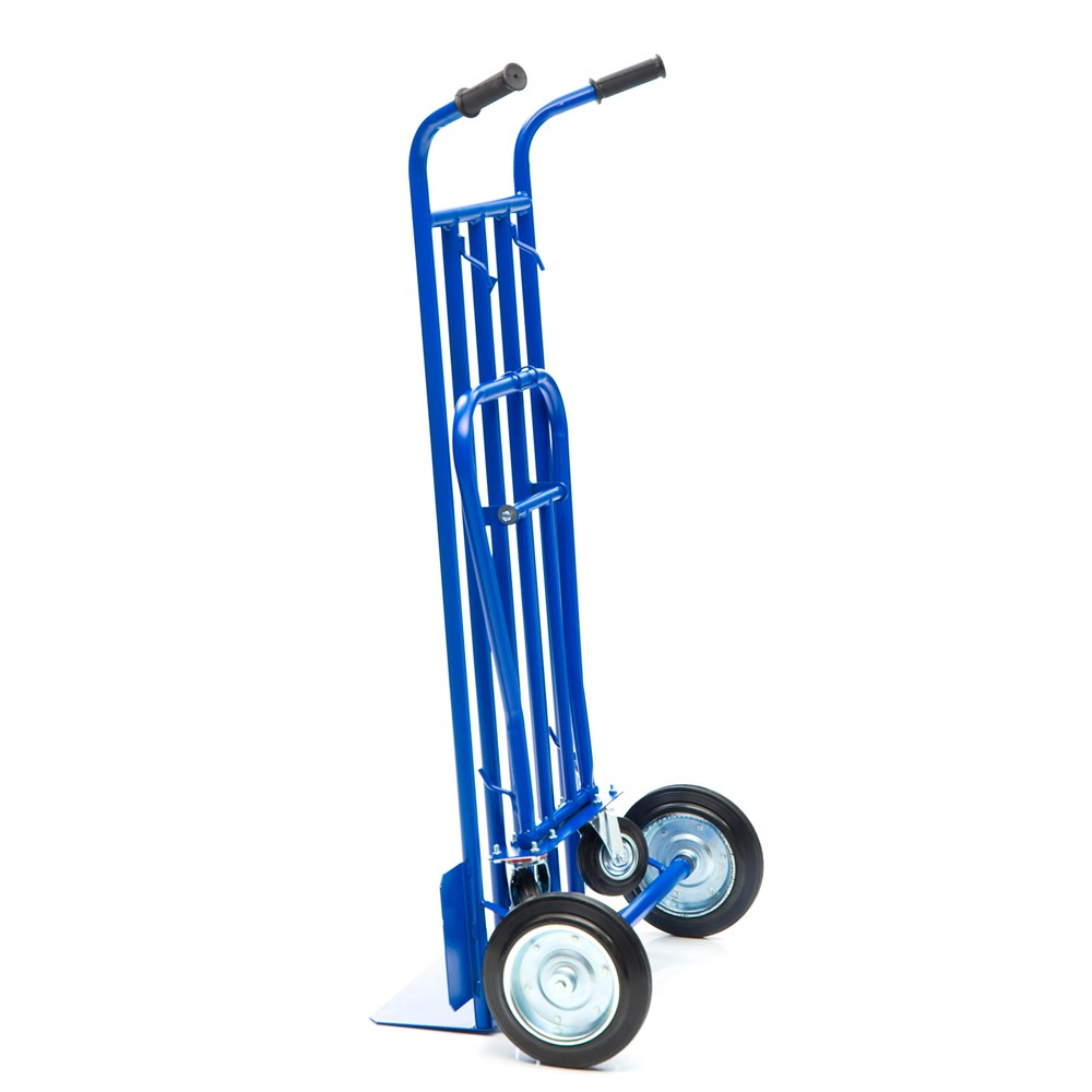 Конструкция принимает три вида: 1. Горизонтальная тележка с бортом и платформой для коробок, мешков, ящиков и комбинированных товаров. 2. Наклонный вариант на трех колесах с площадкой под тяжелые штучные предметы. 3. Двухколесный вариант для перемещения и хранения модели. Размер малой платформы 500х200мм. Размер трубчатой платформы 500х1200мм. На тележке установлены два колеса диаметром 250мм., и два дополнительных колеса диаметром 125мм., для опоры и маневрирования тележкой под наклоном и для работы в горизонтальном положении. Рукоятка имеет удобную для захвата форму и покрыта резиной для удобного захвата.
