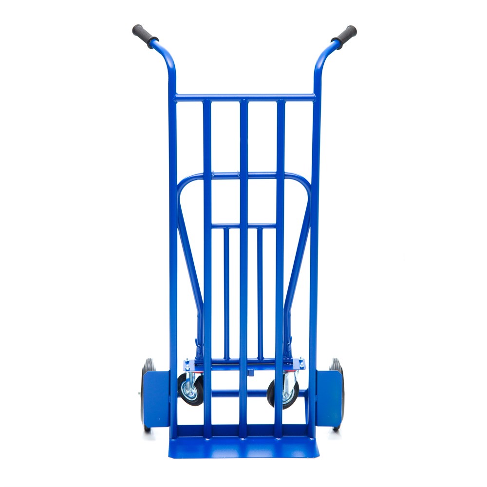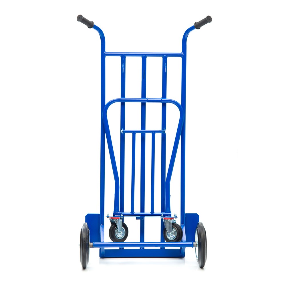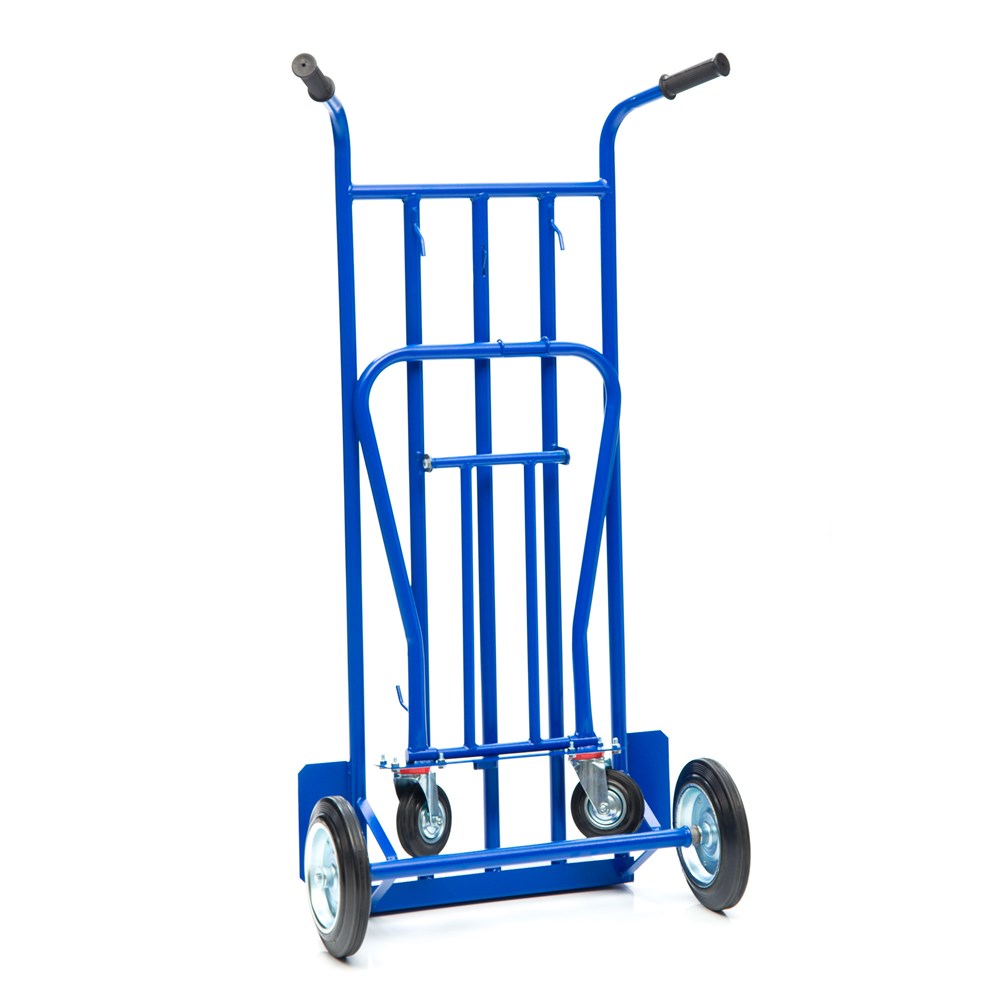 Конструкция принимает три вида: 1. Горизонтальная тележка с бортом и платформой для коробок, мешков, ящиков и комбинированных товаров. 2. Наклонный вариант на трех колесах с площадкой под тяжелые штучные предметы. 3. Двухколесный вариант для перемещения и хранения модели. Размер малой платформы 500х200мм. Размер трубчатой платформы 500х1200мм. На тележке установлены два колеса диаметром 250мм., и два дополнительных колеса диаметром 125мм., для опоры и маневрирования тележкой под наклоном и для работы в горизонтальном положении. Рукоятка имеет удобную для захвата форму и покрыта резиной для удобного захвата.