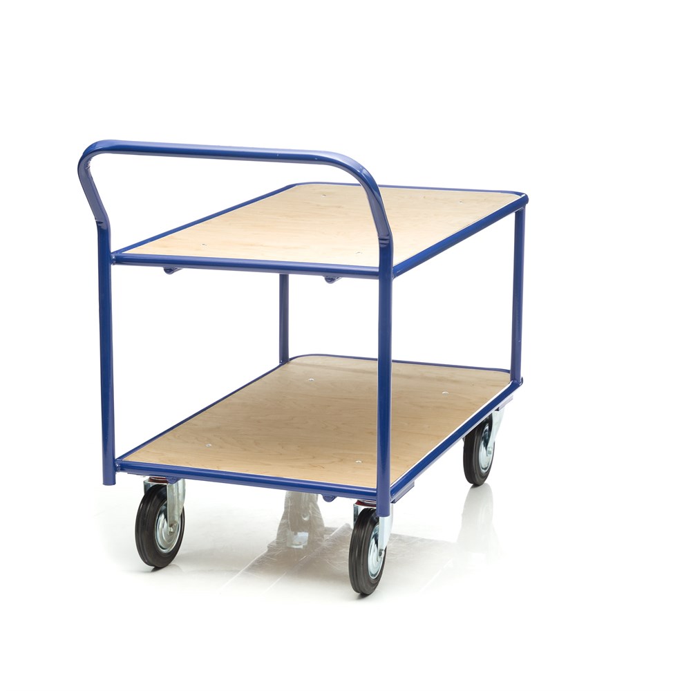 Платформы имеют металлический каркас накрытый фанерой толщиной 10мм., размер платформы 500х800мм., расстояние между ярусами 480мм., количество ярусов 2 шт, габаритная высота 1050мм. Покрытие металлических деталей тележки полимерное, цвет - синий. Тележка широко используется на складах, в торговых павильонах, а также в гостиничном и ресторанном бизнесе. Две платформы позволяют удобно расположить перевозимые предметы.