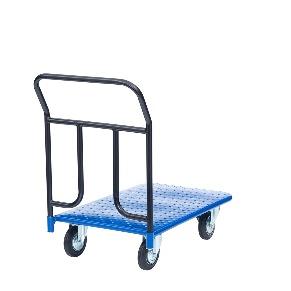 Платформенная 4-х колесная тележка КП-350-125-К используется для перемещения различных грузов в складских помещениях.