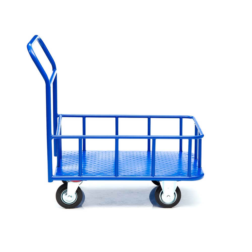 Конструкция тележки цельносварная. Размер платформы 600х900мм., высота борта 150мм., высота ручки 750мм., Платформа имеет уникальную рельефную полимерную противоскользящую поверхность. Цвет - синий, шагрень. Малые габариты, удобная ручка и поворотные колеса обеспечивают высокую мобильность средства, 4 точки опоры гарантируют устойчивость тележки, а наличие невысоких бортов гарантирует безопасность перевозимого хрупкого и мелкоштучного груза.