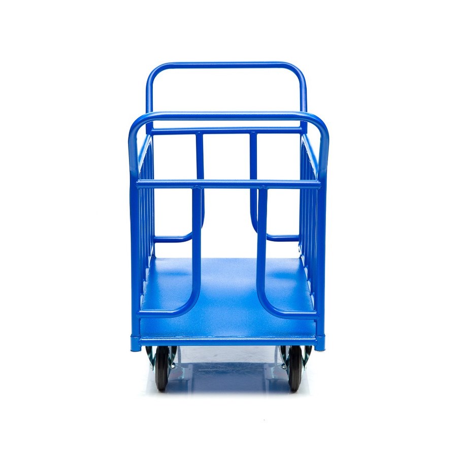 Размер платформы 600х1000мм., Металлический борт груз от падения и ударов, что позволяет перевозить хрупкие предметы и сборные грузы. Ручки и борта тележки снимается для удобства транспортировки и компактного хранения. Высота боковых трубчатых бортов 400мм, высота борта от платформы 480мм., высота ручки 750мм., каркас платформы труба диаметром 28мм., настил металлический лист толщиной 1,2мм., ручка труба диаметром 28мм., толщина 1,5мм. каркас борта труба диаметром 25мм., толщина 1,5мм. Платформа имеет уникальную рельефную противоскользящую поверхность. Покрытие полимерное. Цвет - синий, шагрень.
