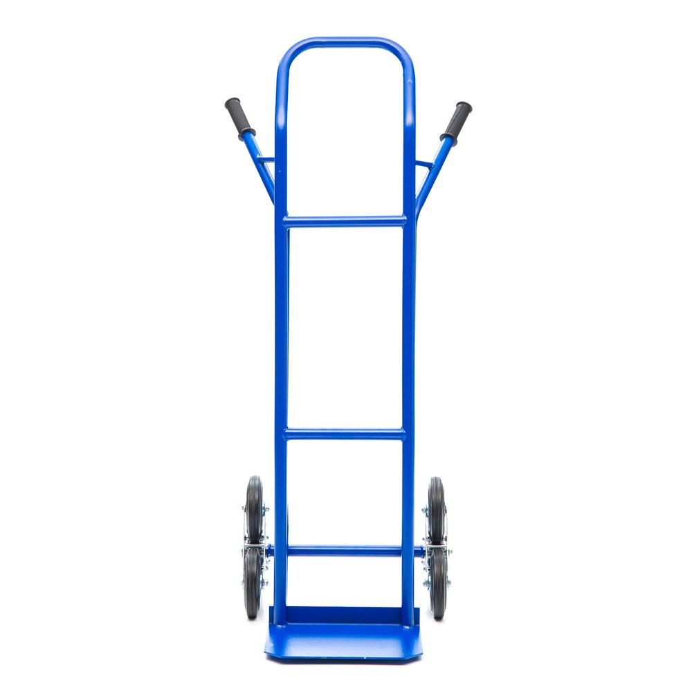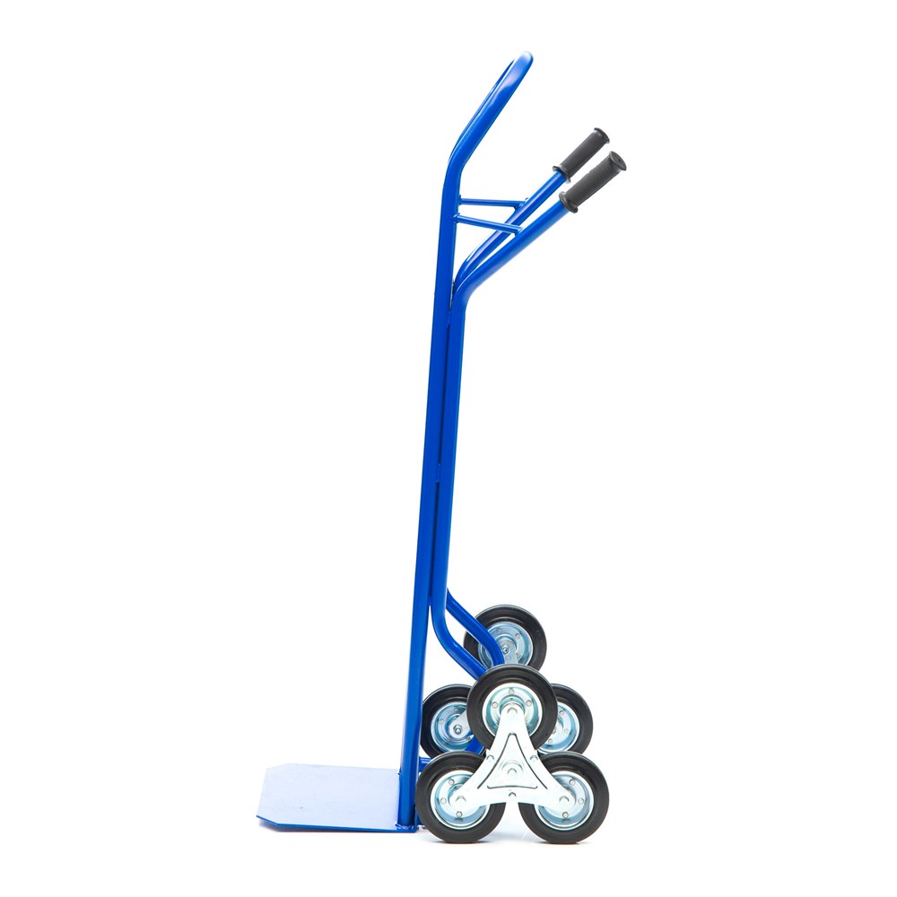 Рукоятки имеют удобную для захвата форму и покрыты резиной, предотвращающей соскальзывание рук. Диаметр каждого из 6 колес-150мм. Большая опорная платформа служит для предотвращения падения груза с тележки.