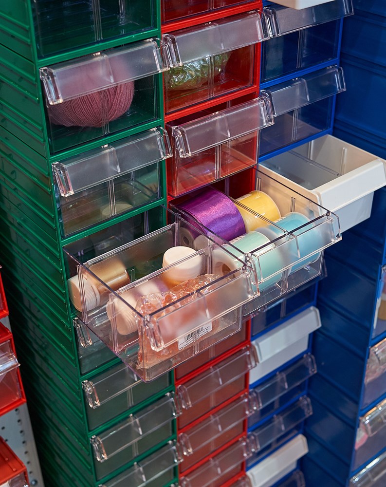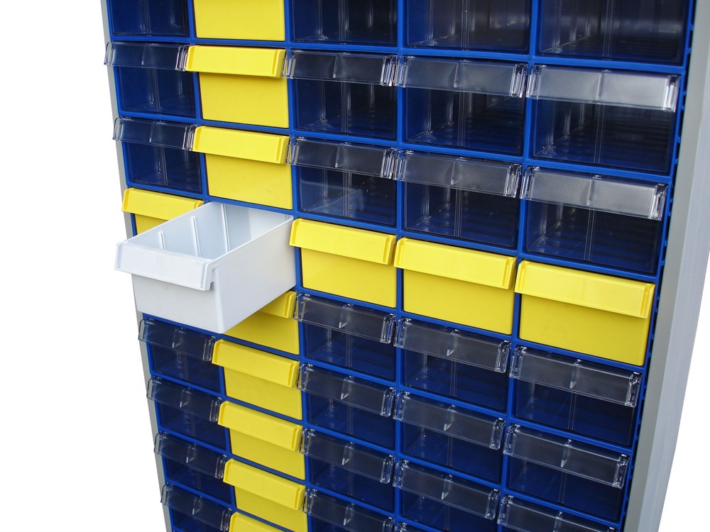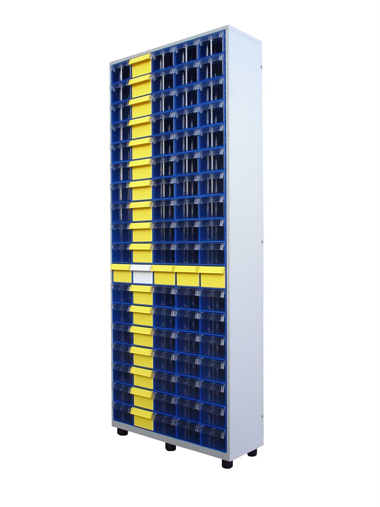 Цвет ламинированного ДСП - серый. Цвет коробов С-2 синий, прозрачный. Главная особенность шкафа – объединение большого количества коробов с определенным типовым размером. Регулируемые ножки шкафа гарантируют устойчивость шкафа даже на неровных полах. Изделие допускает одновременное применение 90 пластиковых складских контейнеров. Прозрачные внутренние короба С-2 позволяют легко находить содержимое и контролировать полноту наполнения.
