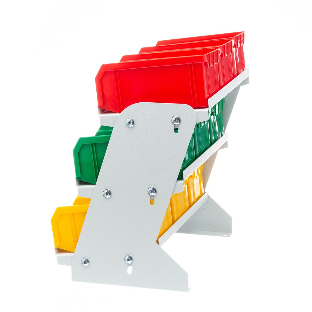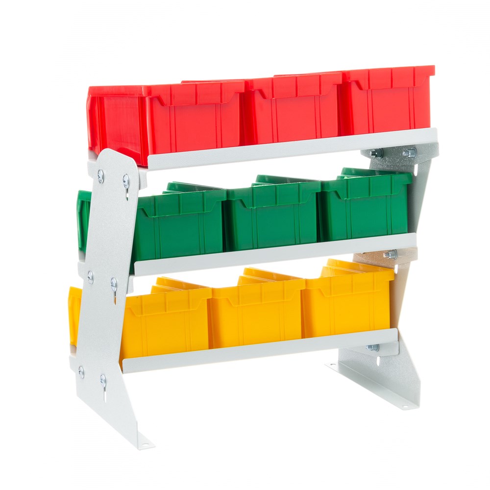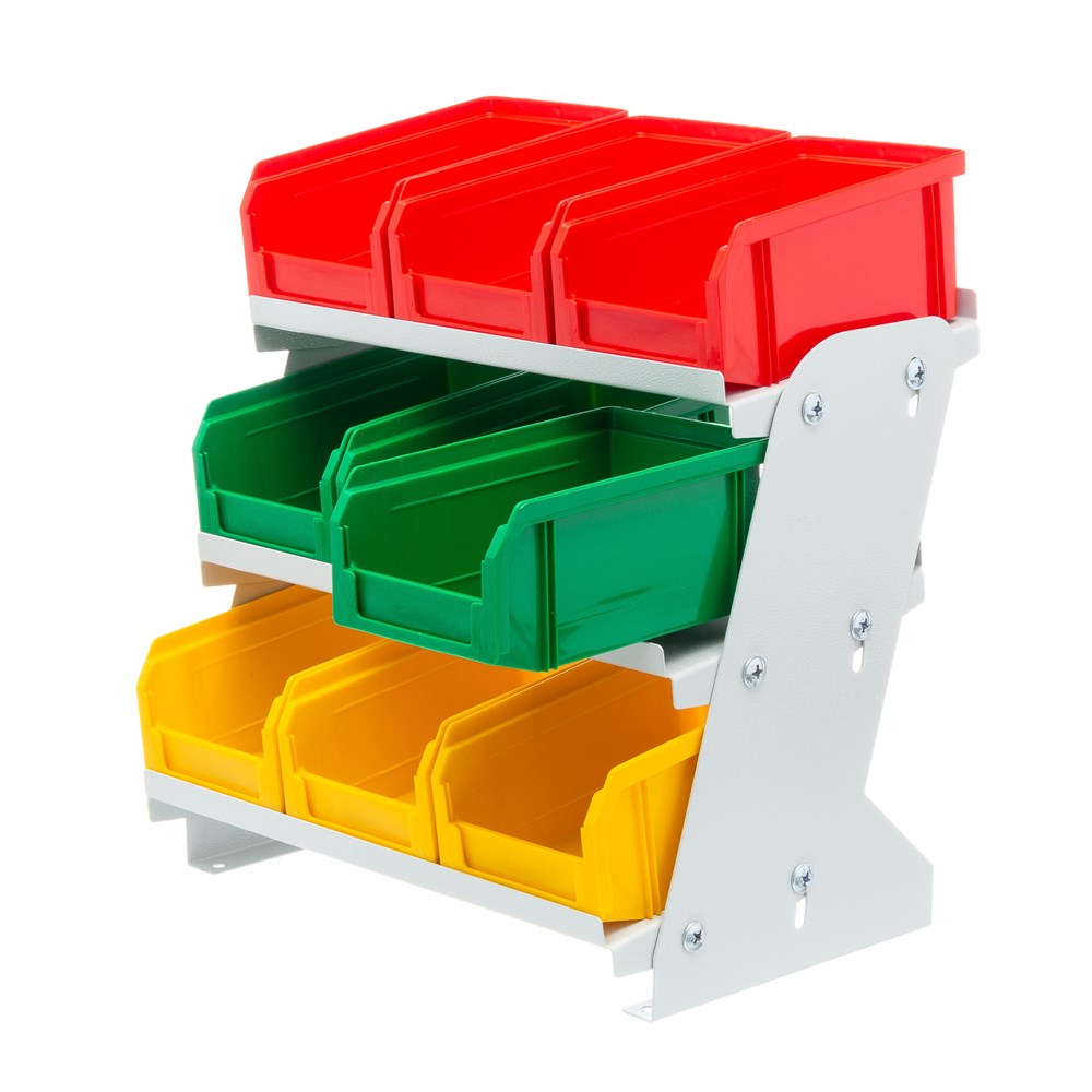 Настольные органайзеры с ящиками V-1 являются отличным дополнением к рабочему месту, где необходим быстрый доступ к мелкоштучным изделиям. Они могут устанавливаться на вашем рабочем столе, тумбе, верстаке, стеллаже, торговой витрине, применяться в автосервисе и т.п. Металлическая конструкция органайзера способна выдержать ящики, полностью нагруженные металлом. Предусмотрена возможность наклона полок для большего удобства работы. В комплект входит: пластиковый ящик V-1 9 шт., настольный органайзер без ящиков V-1. Пять основных цветов ящиков: желтый, зеленый, красный, серый, синий помогут оживить ваше рабочее место, вписаться в корпоративные цвета вашей компании или просто грамотно рассортировать, хранящиеся в ящиках, изделия. При необходимости, ящики легко устанавливаются и снимаются с органайзера.