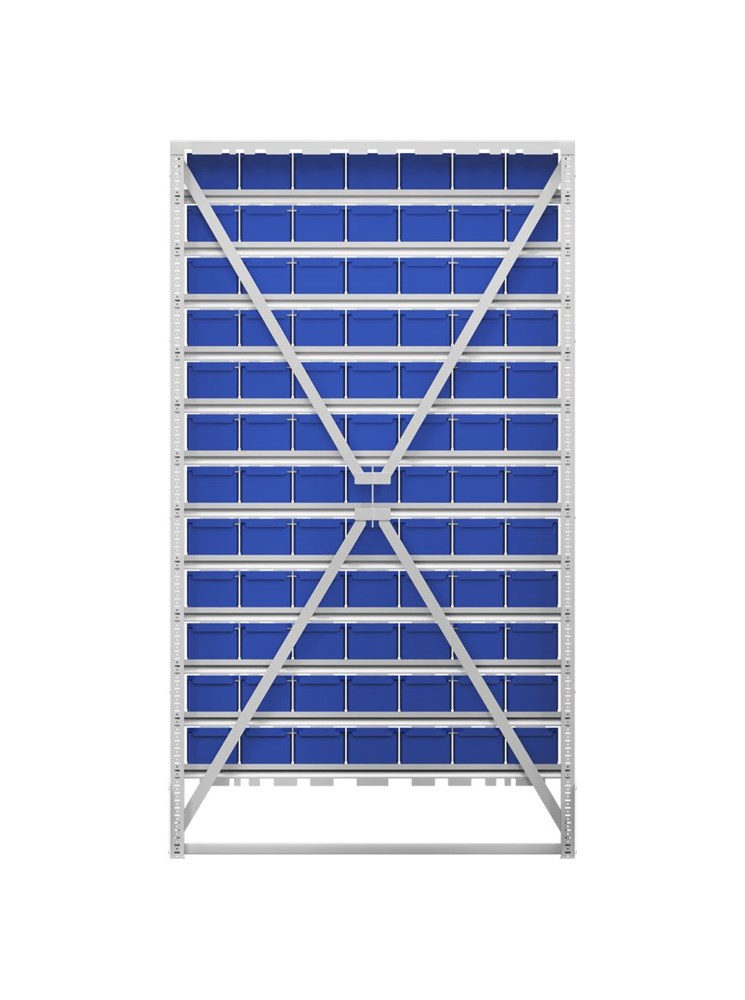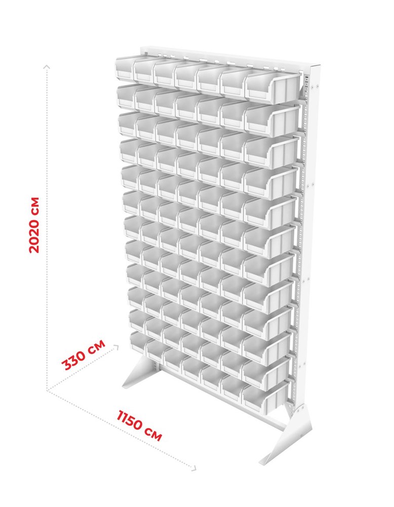 Преимущества: Хороший визуальный обзор содержимого. Каждый ящик оснащен специальным кармашком, позволяющим вставить этикетку для индикации содержимого. Конструкция стойки позволяет легко извлекать нужный ящик и так же легко устанавливать его на место. Быстрая сборка. Высокая прочность. Габариты: 1150х330х2000мм., вес 51кг.