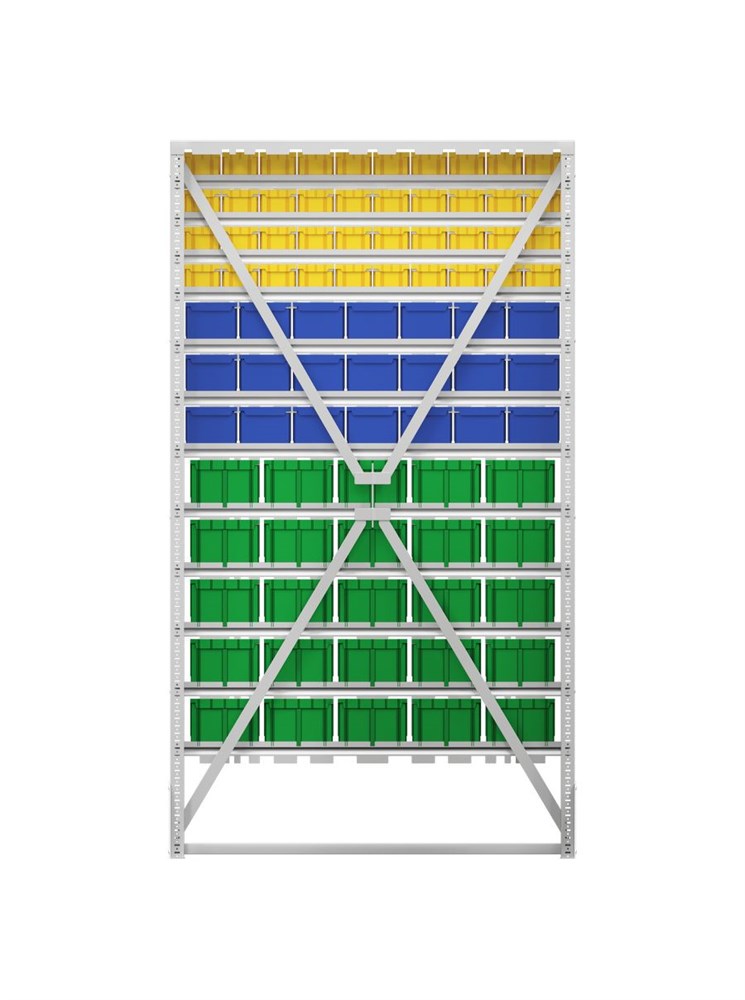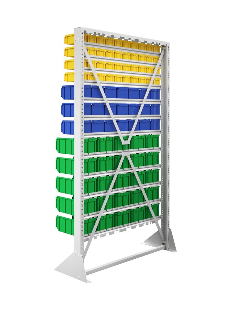 Преимущества: Хороший визуальный обзор содержимого. Каждый ящик оснащен специальным кармашком, позволяющим вставить этикетку для индикации содержимого. Конструкция стойки позволяет легко извлекать нужный ящик и так же легко устанавливать его на место. Быстрая сборка. Высокая прочность. Габарит: 1150х330х2000мм., вес 49кг.