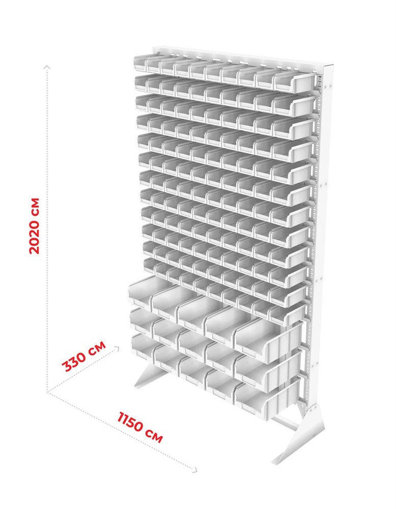 Преимущества: Хороший визуальный обзор содержимого. Каждый ящик оснащен специальным кармашком, позволяющим вставить этикетку для индикации содержимого. Конструкция стойки позволяет легко извлекать нужный ящик и так же легко устанавливать его на место. Быстрая сборка. Высокая прочность. Габариты: 1150х330х2000мм., вес 56кг.