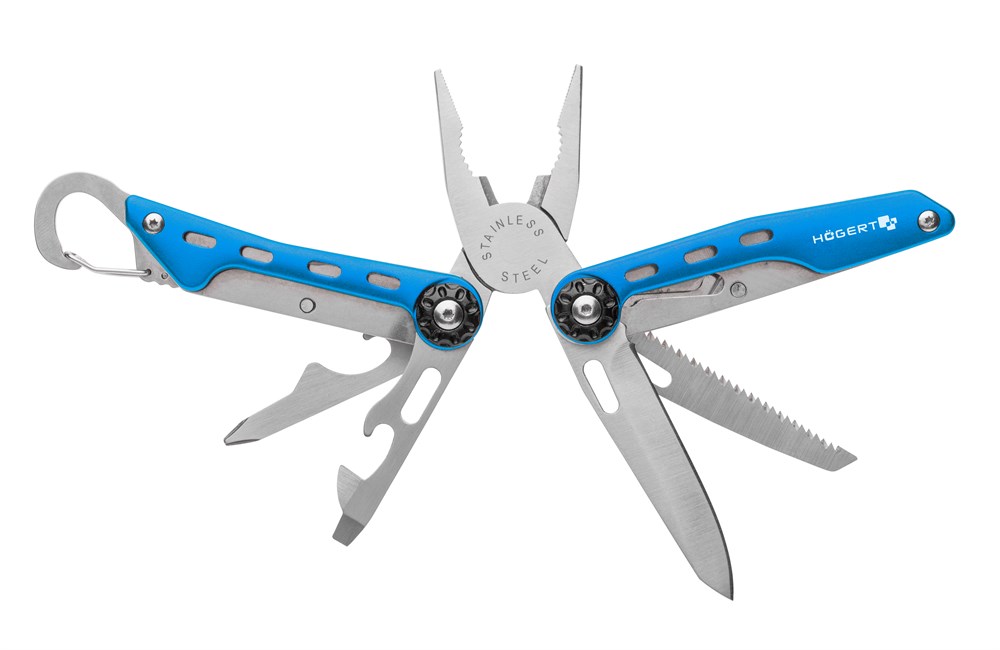 - 10 функций в 1- м инструменте: подвес, открывалка для бутылок, консервный нож, крестовая отвертка, плоская отвертка, нож, пилка, кусачки,